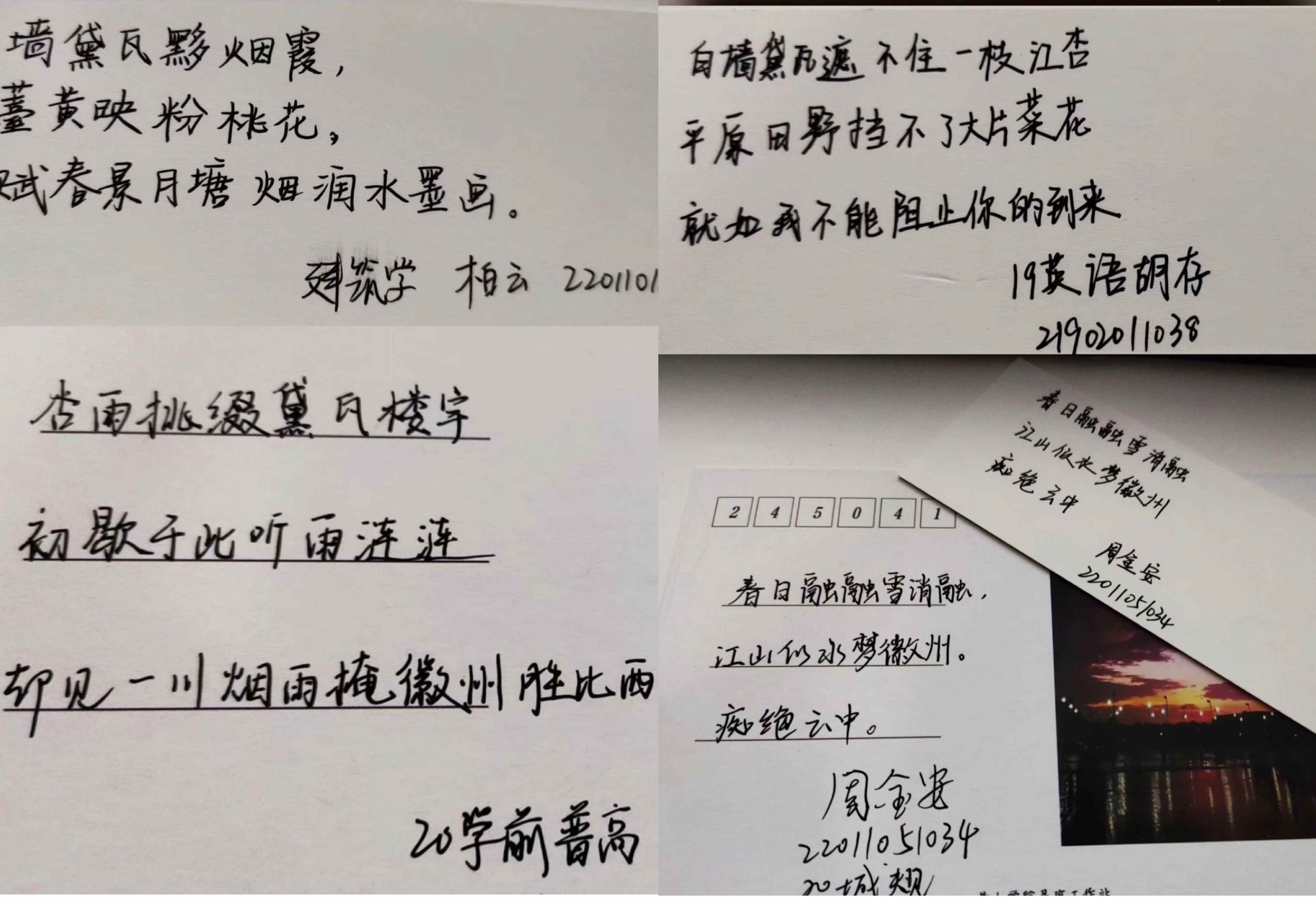 为深化习近平新时代中国特色社会主义思想宣传教育,进一步强化大学文化建设,以坚定的文化自信迎接建党一百周年,推动中国特色社会主义文化繁荣兴盛,2021年3月21日,由徽州学社主办的“阳春三月与诗戏,趣品诗歌美如画”主题诗歌会永利yl23411集团率水校区开展。同学们以自己的方式来赞美和感受徽州的春天,大家抓住了春天与徽州的特点,依靠自己独有的情感,创作出一份份优秀作品。