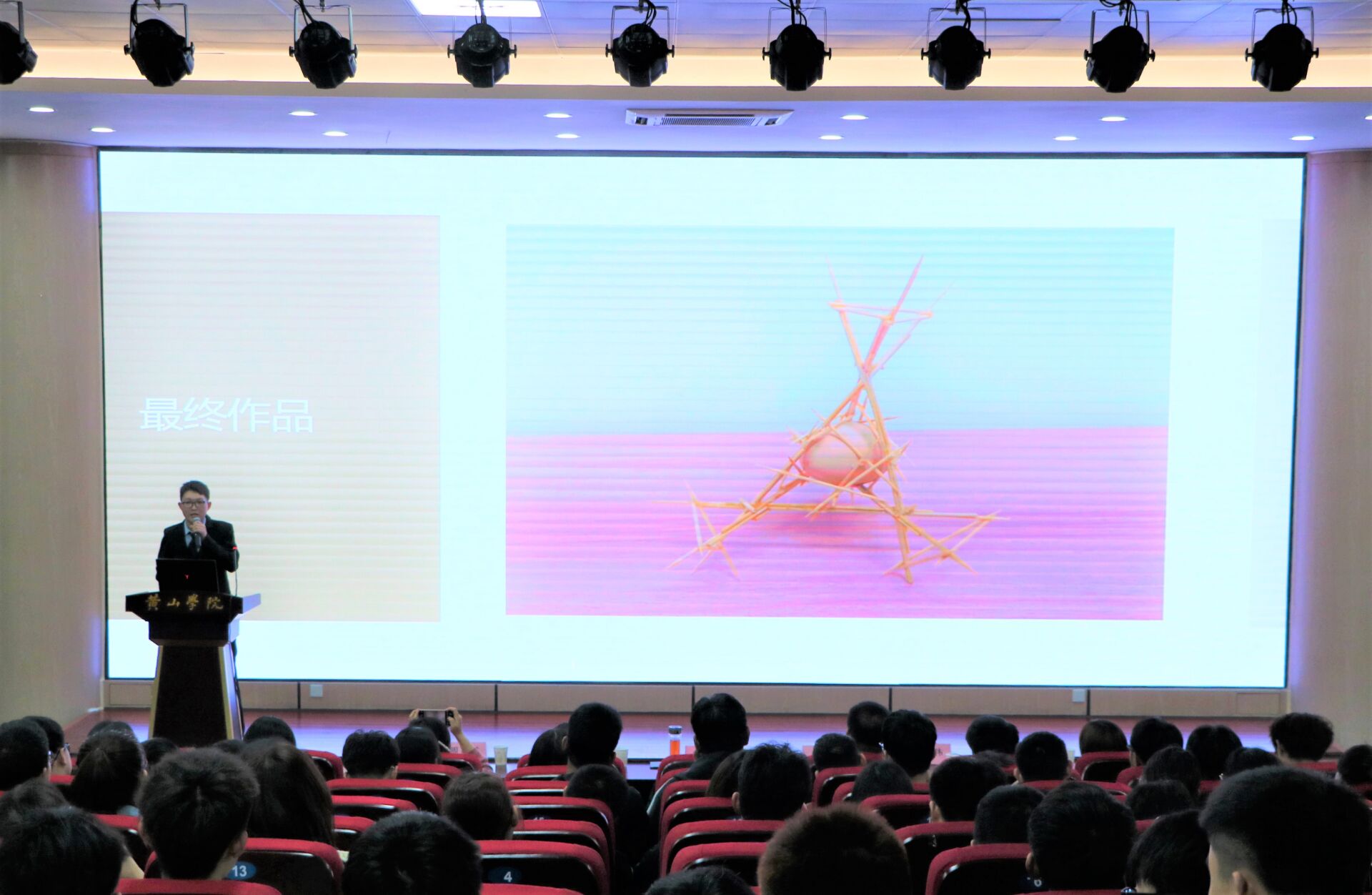 本次比赛全院共有36组作品参加比赛,参赛者经过数次的头脑风暴设计出了抗震缓冲结构,让鸡蛋在自由下落过程中完好无损。其中,十八组作品,顺利进入决赛。颁奖环节中,获得一等奖的选手作为代表,通过PPT讲解、现场作品展示的方式从作品的整体构造、立体结构、灵感来源、设计思路等方面进行了展示。