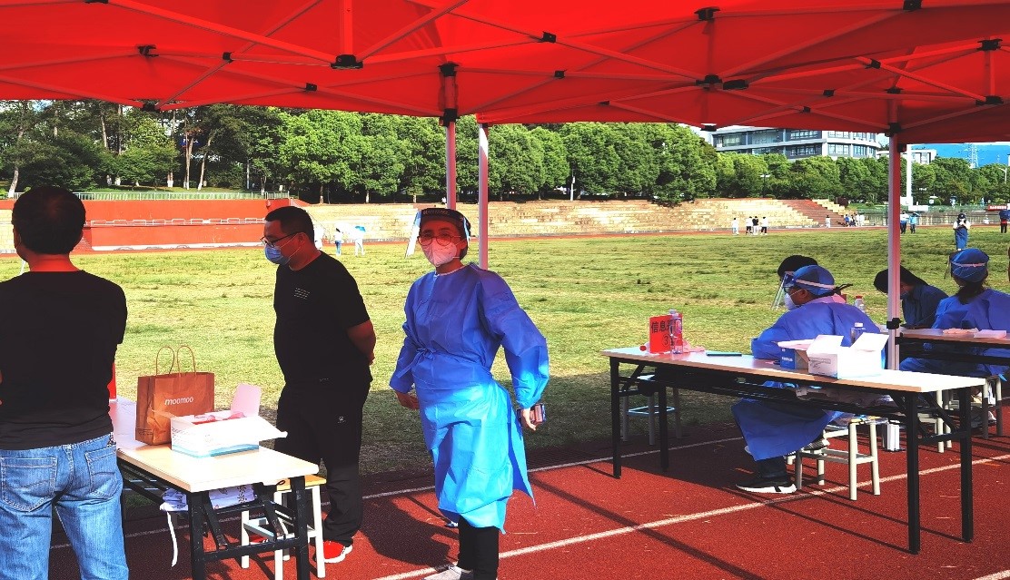 烈日下、细雨里,我院教职工志愿者坚守校园核酸检测工作的一线,参与构筑一道牢固的校园战“疫”防线。