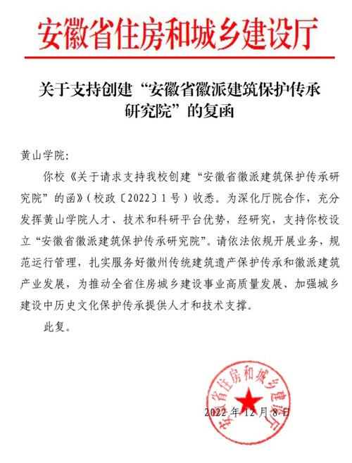 近日,安徽省住房和城乡建设厅复函我校,正式批准我校设立“安徽省徽派建筑保护传承研究院”。
