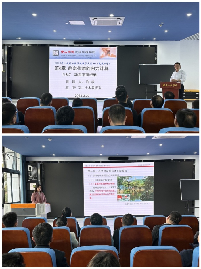 在教学展示环节,许政、苏梦蓓两位优秀教师分别以“静定桁架的内力运算”、“公共建筑的总体环境布局”为主题进行教学展示。许政老师从平面汇交力系平衡方程引出静定桁架的内力结点法,将复杂问题简化为力学模型,整个求解过程环环相扣,逻辑清晰,课件与板书有机结合,内容由易到难,层层深入;苏梦蓓老师以北京故宫、无锡寄畅园为例,主要讲解了公共建筑的主体环境布局,整个授课过程一气呵成,引人入胜。两位教师结合自身教学特长与专业优势积极准备,全心投入,在整个教学环节中展现出扎实的专业功底和良好的教学素养。