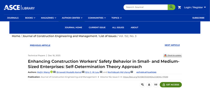 我校yl23411永利集团教师汪海津博士与马来西亚理科大学、英国曼彻斯特城市大学学者合作的最新研究成果“Enhancing Construction Workers’ Safety Behavior in Small- and Medium-Sized Enterprises: Self-Determination Theory Approach”在工程管理领域权威期刊Journal of Construction Engineering and Management上发表。该期刊隶属美国土木工程师学会(American Society of Civil Engineers,ASCE),为中科院二区期刊(五年期IF=5.6)。永利yl23411集团为本文的第一署名单位。