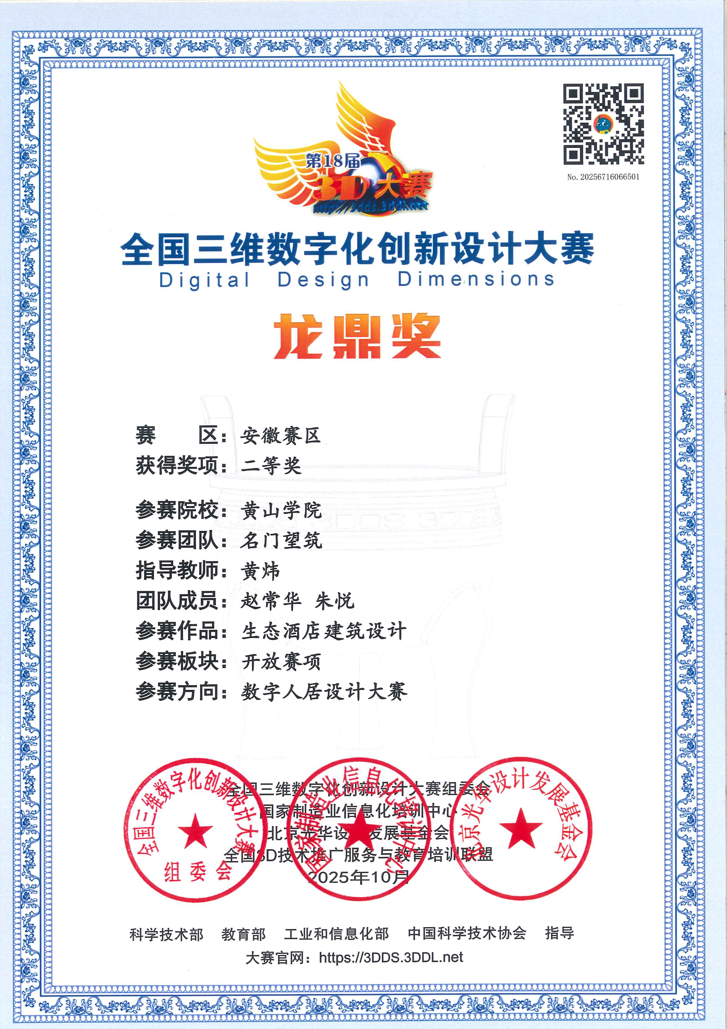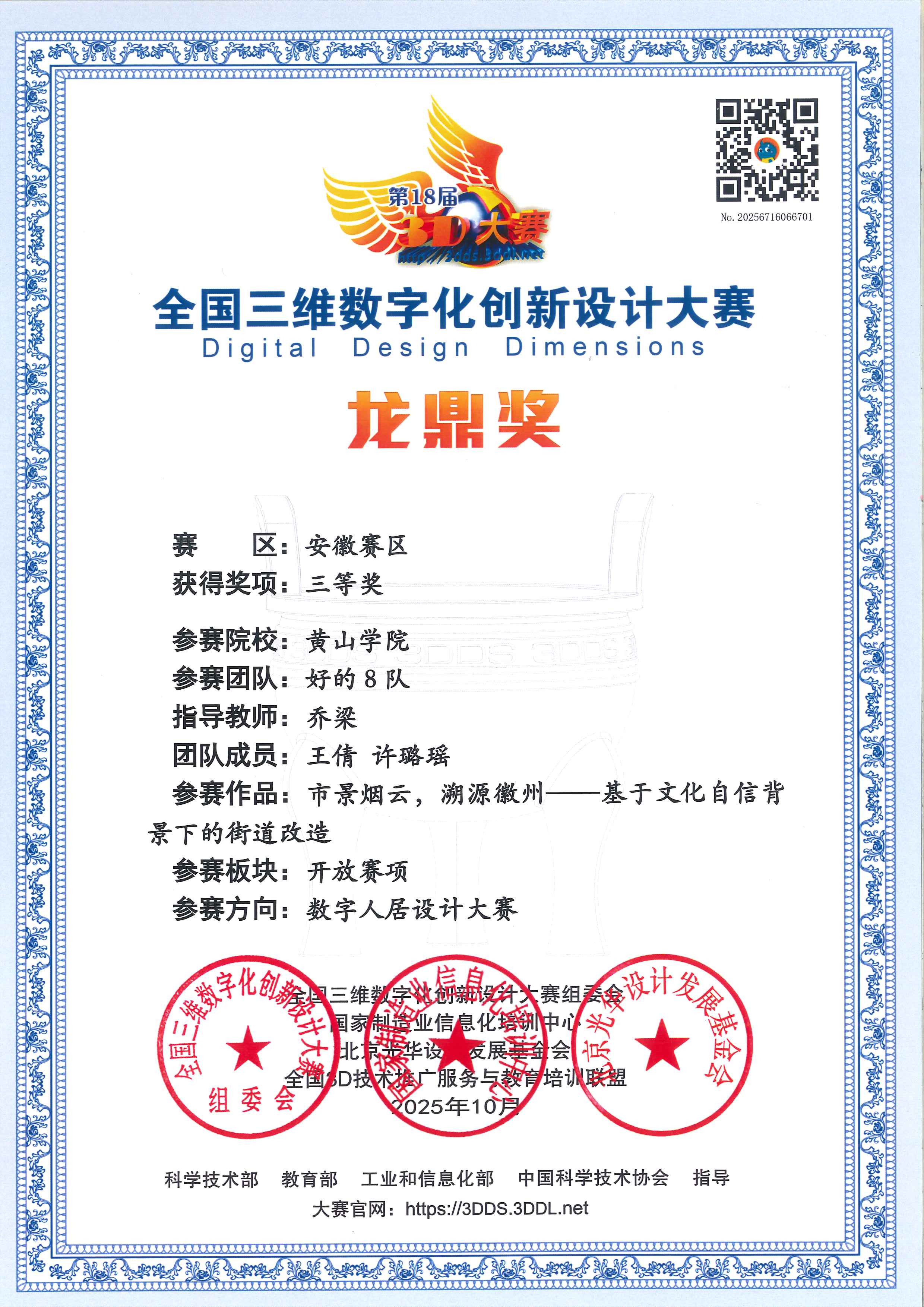 2025年“第18届全国三维数字化创新设计大赛” 省赛评比上,由我院赵常华、朱悦、王倩、许路遥等四位同学所组成的两支队伍,在黄炜、乔梁二位老师的指导下分别获得安徽省赛区二等奖,三等奖的佳绩。