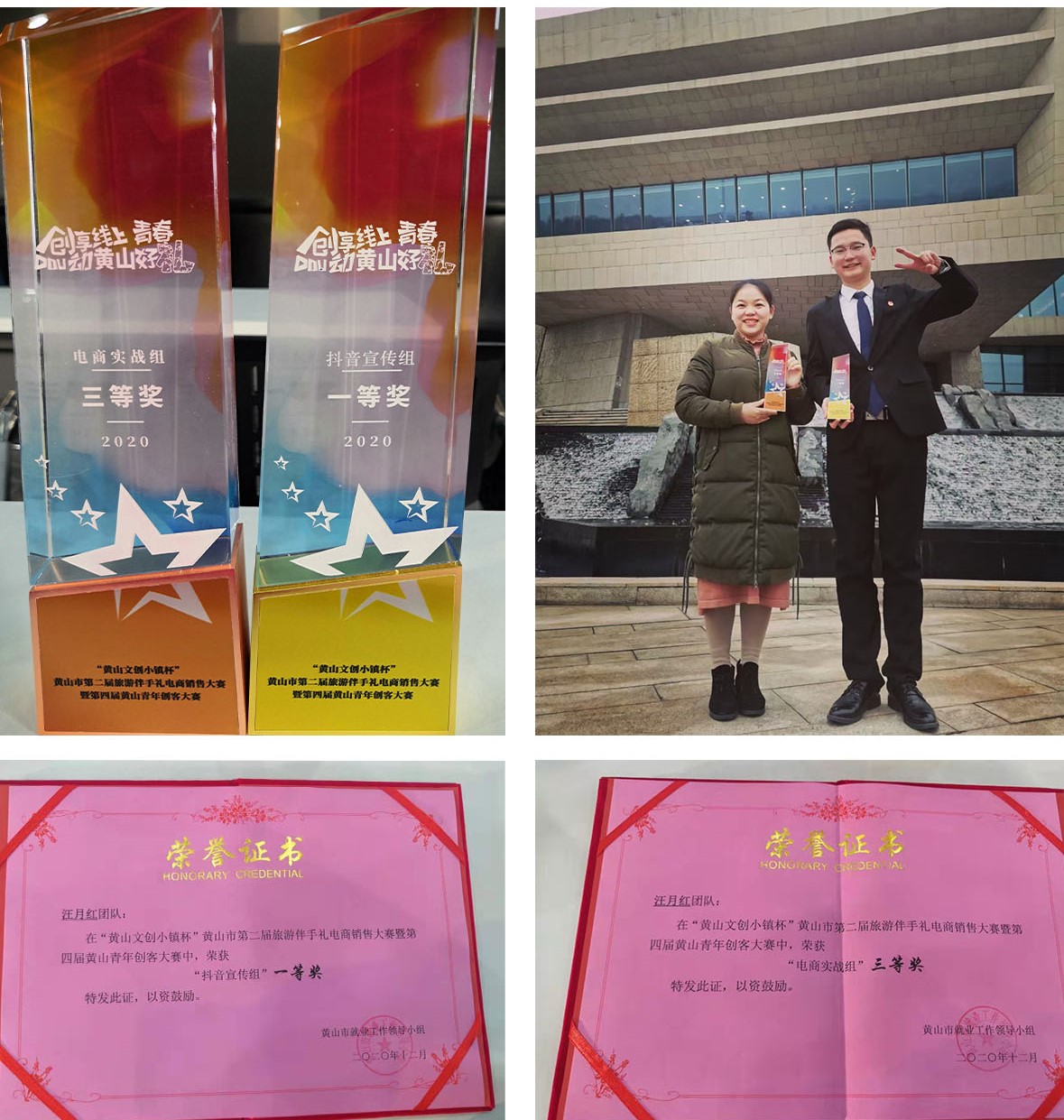汪月红团队创业项目荣获第四届黄山市青年创客大赛——抖音宣传组一等奖,电商实战组三等奖,这不仅充分体现了我院师生的创业风采,更体现了学院对学生科技创新能力的重视与培养。