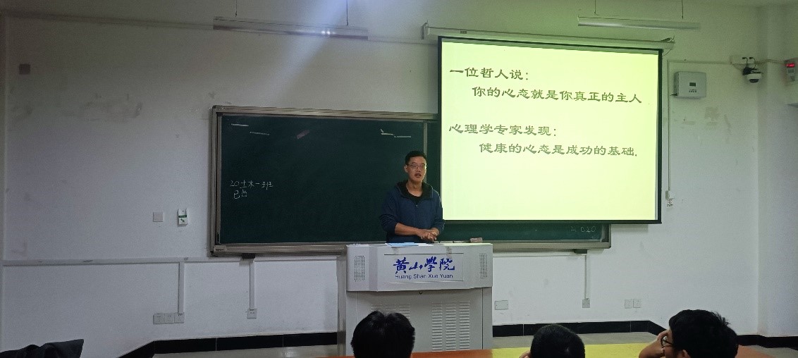 班会上王鹏飞老师向同学们普及了心理健康知识,内容涵盖了大学生常见的心理问题、心理健康判断标准、心理问题解决方法、人生价值取向等多个方面,班级内展开了积极讨论。