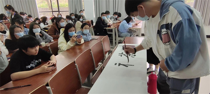 随后同学们纷纷尝试,比划着茶道礼仪,在纸上挥动毛笔。