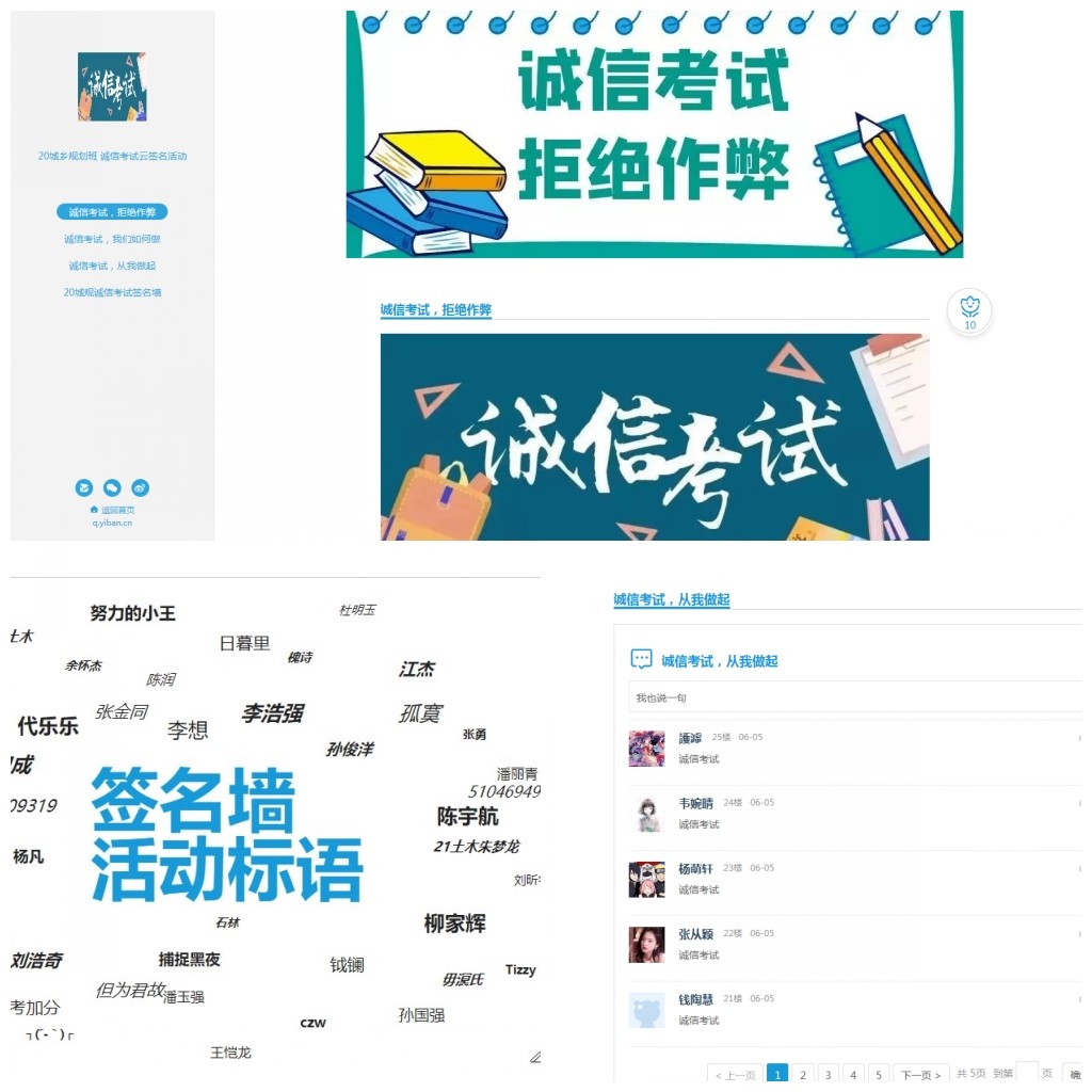 通过易班、班级群以及“建工院的那些事儿”微信公众号等平台线上发布诚信倡议,组织学生通过线上诚信签名,以留言评论等方式倡导学生立诚信身、做诚信人、诚信践事、诚信交友,做新时代诚信大学生,发挥诚信教育活动组织力。