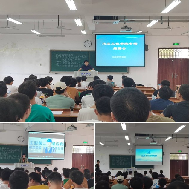 2022年9月24日上午永利yl23411集团就业指导中心于率水校区逸夫图书馆东侧广场举办了2023届毕业生工科类专场招聘会,我院邀请了包括中铁四局四公司、中国核工业第二二建设有限公司等六家优质企业参与本次专场招聘。为加深同学们对本次邀约六家单位的了解,建工院当天下午2点30分在文渊楼1305室为六家单位集中举办了专场招聘宣讲会。