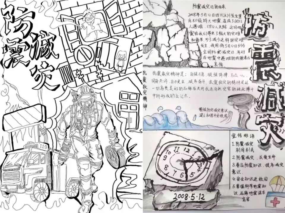 活动中,同学们以医护工作者、消防员、救援车辆、防灾救援物资等为元素手绘漫画作品,象征着保障人民生命安全,众志成城,共同防灾减灾的寓意。