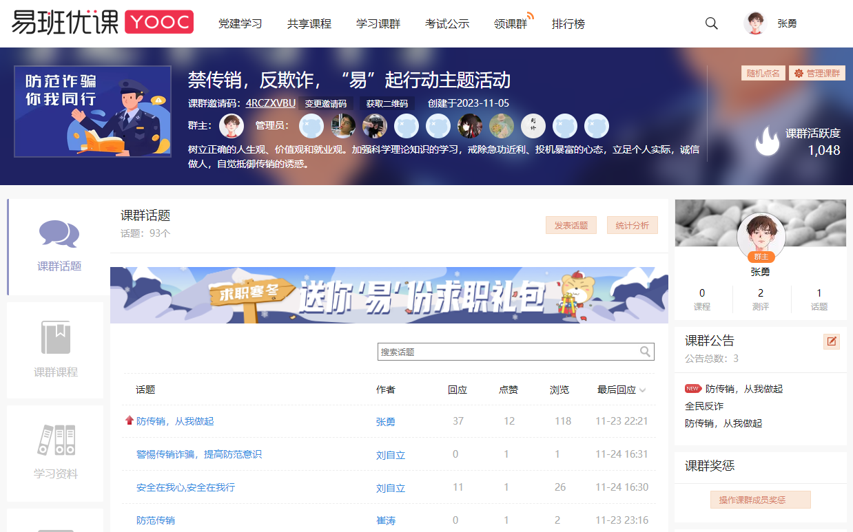 活动期间,工作站组织创建易班优课群,同学们登录易班,加入课群,观看学习反诈、防传销的视频,参与防传销话题讨论,参加知识竞答。对于参与度高的同学,工作站根据活跃度排名赠送精美小礼品。