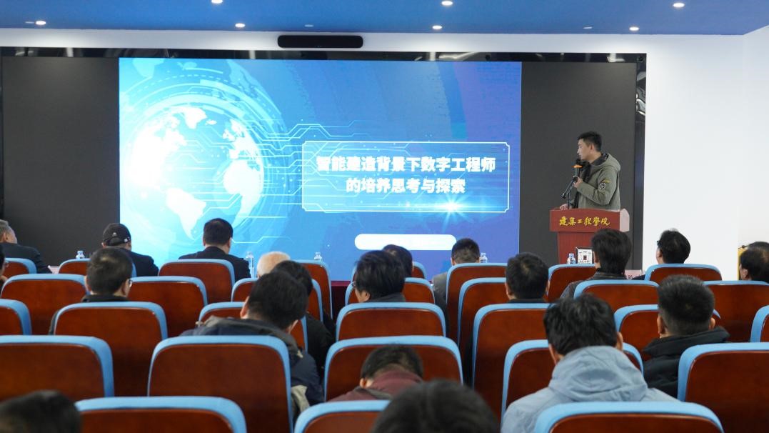 启用仪式后,还举行了智能建造专业建设研讨会,来自省内外的专家进行了精彩的讲座和交流。张春彦作题为《天津大学建筑遗产保护》的交流报告,详细介绍了天津大学在遗产保护工作中所取得的成绩以及面向未来-校内交叉、校外联合的遗产保护学科交叉新体系,为古建筑遗产保护提供新的思路。王静峰作题为《智能建造专业建设与产业融合》的交流报告,详细介绍了智能建造专业发展历程、趋势、定位以及目前所存在的问题和挑战,为智能建造专业的进一步发展和专业人才的培养给出了建设性的建议和思路。上海元班数字科技有限公司总经理赵伟作题为《智能建造背景下数字工程师的培养思考与探索》的交流报告,对数字孪生技术的发展趋势和在智能建造中的应用作了详细介绍,在人才培养和专精特新科研教学方面给出新的探索思路和企业解决方案。