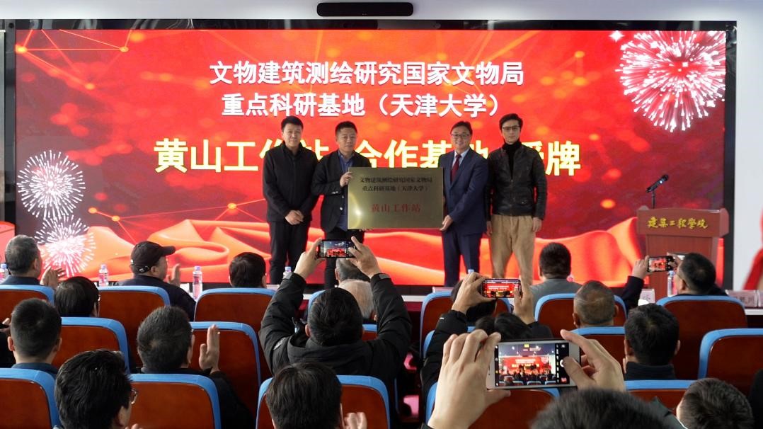 启用仪式上,与会领导、相关专家及企业负责人观看了智能建造教学实训中心的宣传片,并举行了文物建筑测绘研究国家文物局重点科研基地(天津大学)黄山工作站合作基地授牌仪式。