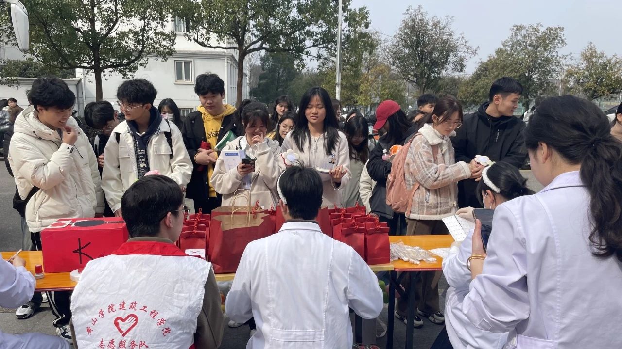活动现场还设置了非常多有趣的环节,设置打卡板、知识问答、免费测血型等等,充分调动同学们的积极性。志愿者们分组行动,有的宣传无偿献血知识,招募无偿献血者;有的咨询献血者身体健康情况,协助填写表格;有的端起糖水、点心,提醒献血者不能空腹献血;有的提醒献血者注意休息,并送上献血证和纪念品。志愿者从一早就开始忙碌,车下车上爱心接力,环环相扣,每位志愿者有条不紊的为无偿献血者提供温馨的服务。