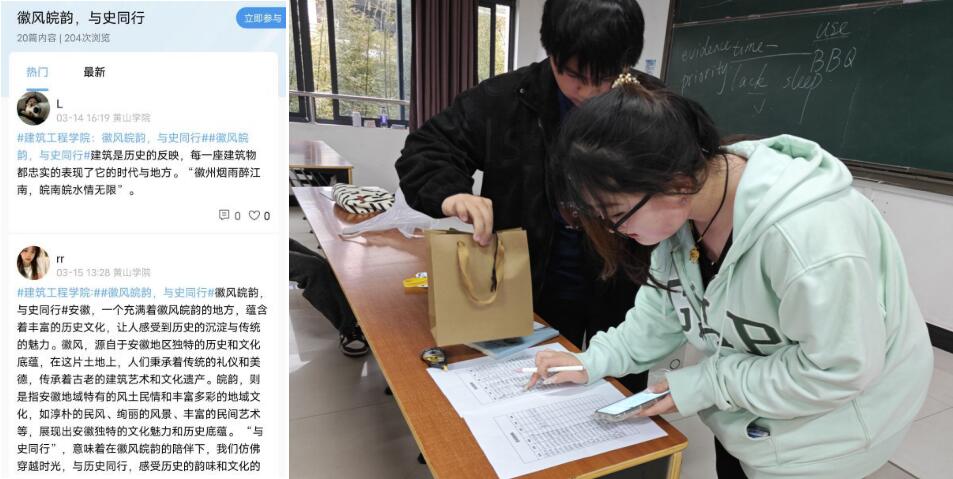 活动要求参与者完成不少于800字的文稿,发布至易班课群参加评比。通知发布后,吸引了全校同学踊跃报名参与,大批同学在易班轻应用中参与评论并通过易瞄瞄发表了自己对于徽州文化的认识和理解。