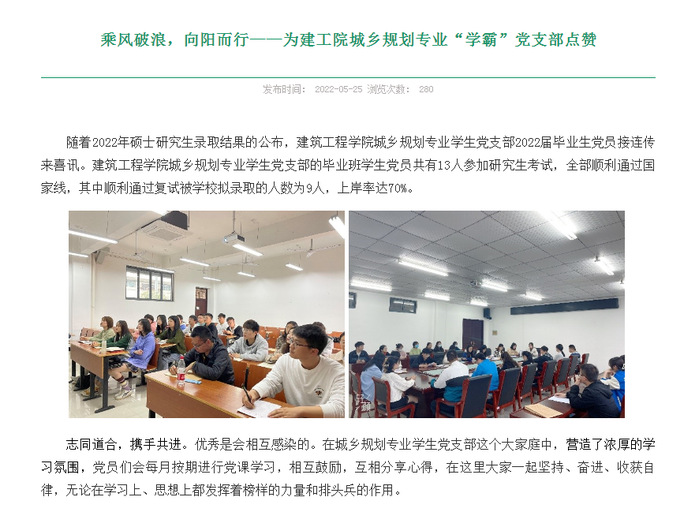 坚持以知行合一为导向。强化价值引领,将工科专业课程的理论融入实践,实现知行合一。积极助力乡村振兴,建筑学教工支部和碧阳镇碧山村党委在碧山村签订校地合作共建协议。1个党支部被评为三星级党支部,1个“样板支部”通过校级首批新时代党建示范创建和质量创优项目验收,8人被评为“优秀共产党员”,1个支部13人考研全部通过了国家线,9名党员学生被录取,被学校宣传报道为“学霸党支部”。