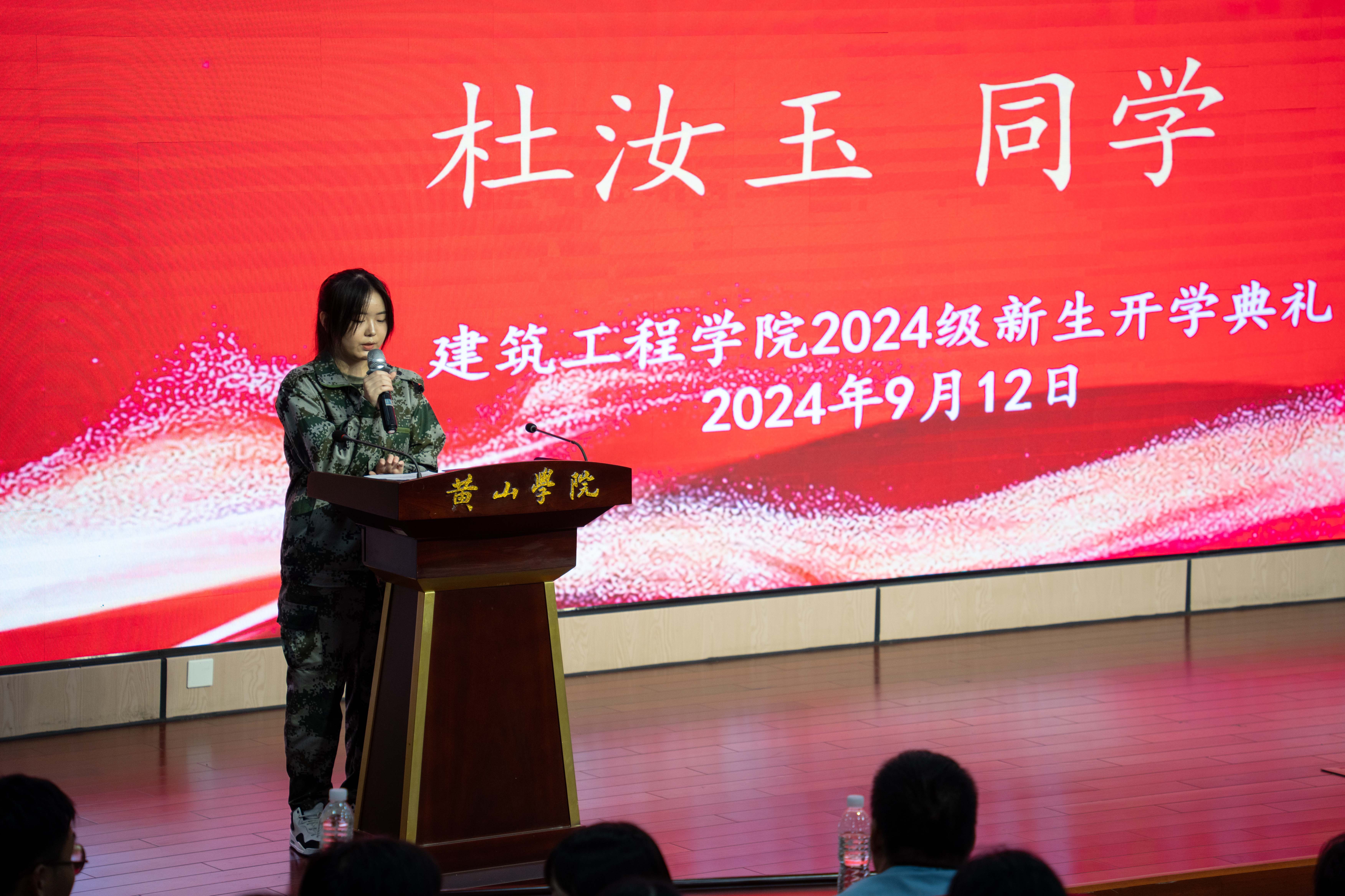 新生代表24工程造价班杜汝玉同学,表达了对未来大学生活的期待和努力奋斗的决心。同时也呼吁全体新生要珍惜大学时光,勇敢追求自己的梦想,为自己的未来努力奋斗。