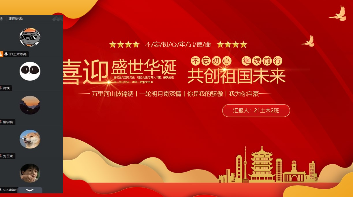 此外,9月30日,各班团支部还通过知识竞赛、分享交流会、主题演讲、诗朗诵、红歌合唱等多种形式,并结合自己的所见所闻、所学所思、所悟所感进行交流,表达对祖国母亲的美好祝愿。