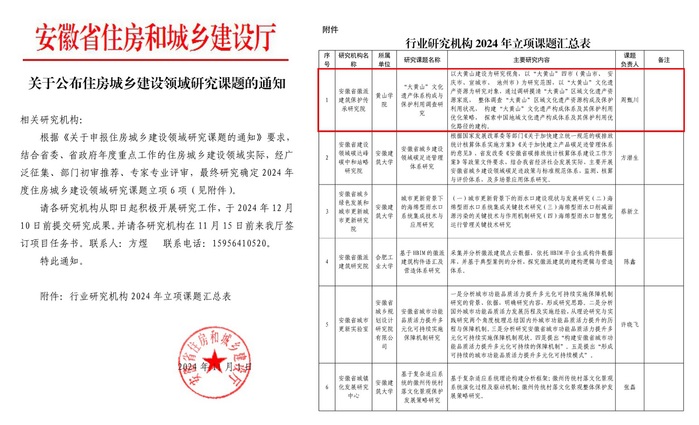 日前,安徽省住房和城乡建设厅公布了2024年住房城乡建设领域研究课题,我校省级科研平台——安徽省徽派建筑保护传承研究院申报的课题《“大黄山”文化遗产体系构成与保护利用调查研究》成功获得立项,资助经费为12万元,这是我校首次获得该领域的课题立项支持。