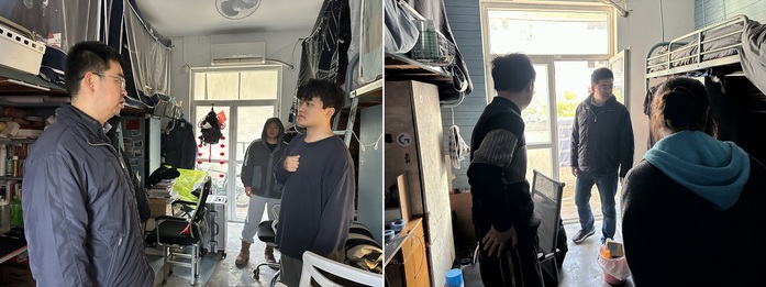 在传递关怀的同时,走访团队高度重视宿舍安全与环境卫生。老师们逐一检查用电设施、消防通道及卫生死角,针对插线板规范使用、大功率电器隐患等问题进行现场指导。“安全无小事,细节定成败。”王泽梁强调,要求同学们严格遵守宿舍管理制度,做到“人走断电、定期通风、及时清理”,共同营造安全、整洁、和谐的“家文化”氛围。